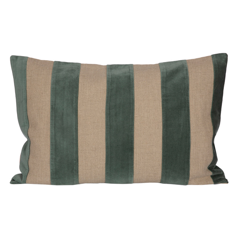 La funda es de lino y terciopelo en el frente, y lino a tono en el reverso. Cierre metálico invisible en el lateral de la funda.