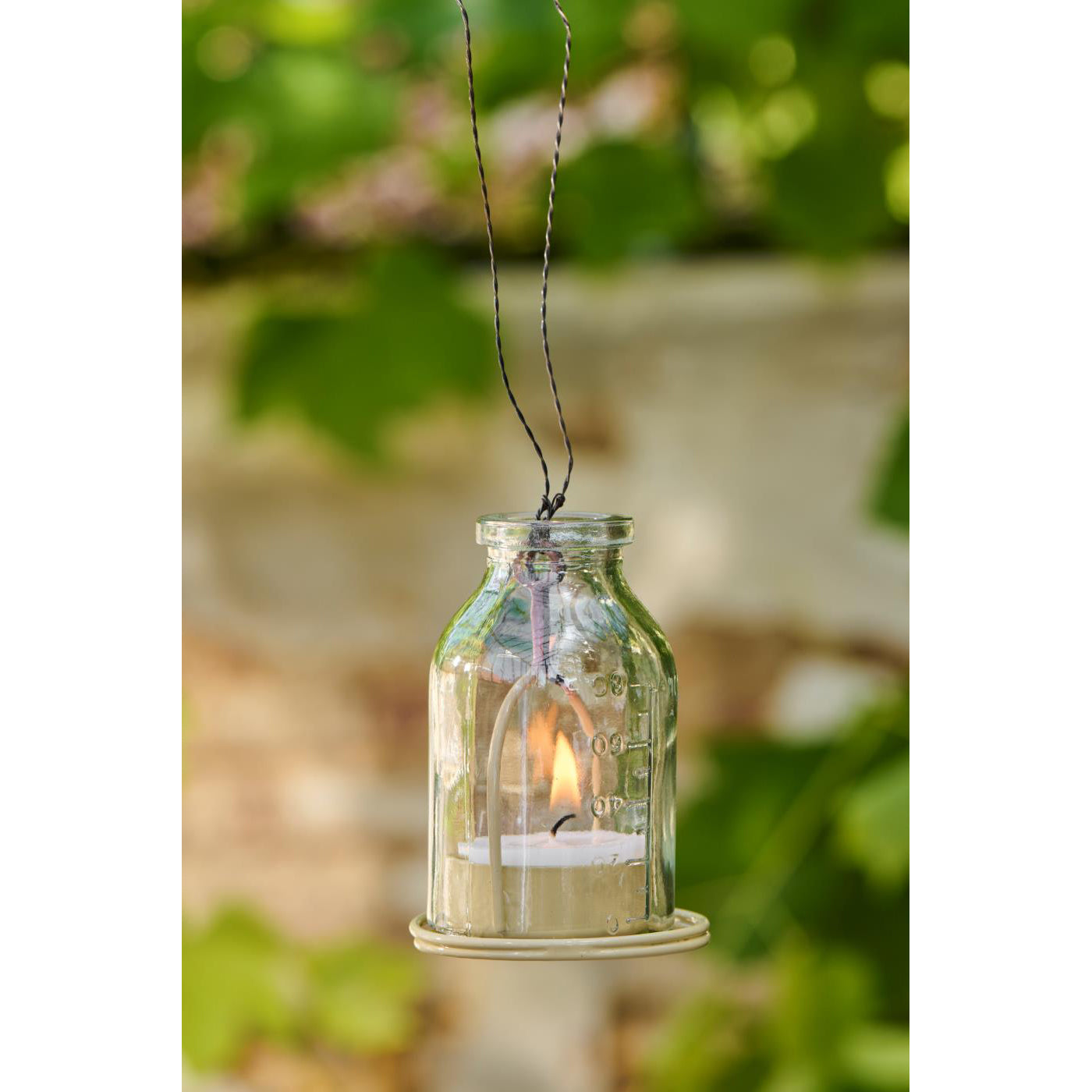 Pequeñas y coquetas lámparas para colgar con base metálica extraíble, donde puedes colocar una vela pequeña. Se pueden colgar de un árbol o en la terraza con un pequeño alambre de metal, para crear un ambiente acogedor. Ten en cuenta que el color del alambre que sostiene las botellitas, se verá afectado por el calor de las velas.